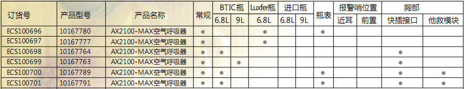 BTIC气瓶,无表,500C减压器,标准报警哨,标准中压管,AX压供阀,UE面罩,橡胶头带,标准版肩带,AX-B60CSSXURB0;