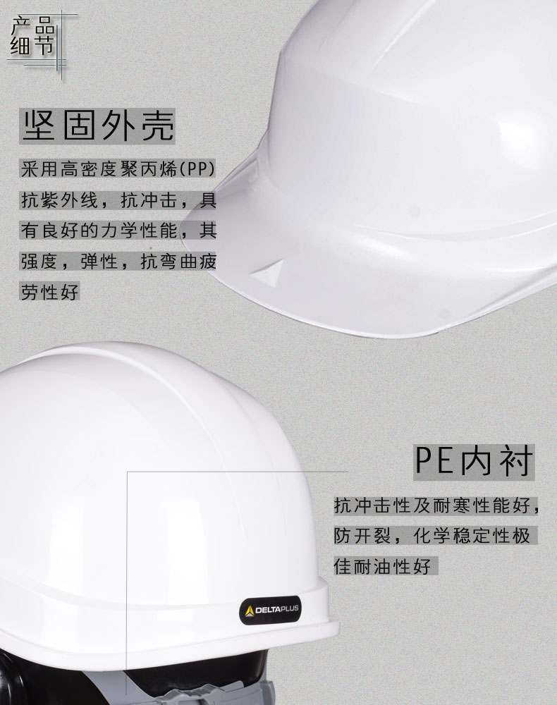 产品简介:锆石1型抗紫外线高密度聚乙烯(PE)安全帽,8点式PE内衬,插片后箍调节,绝缘,配有吸汗带。