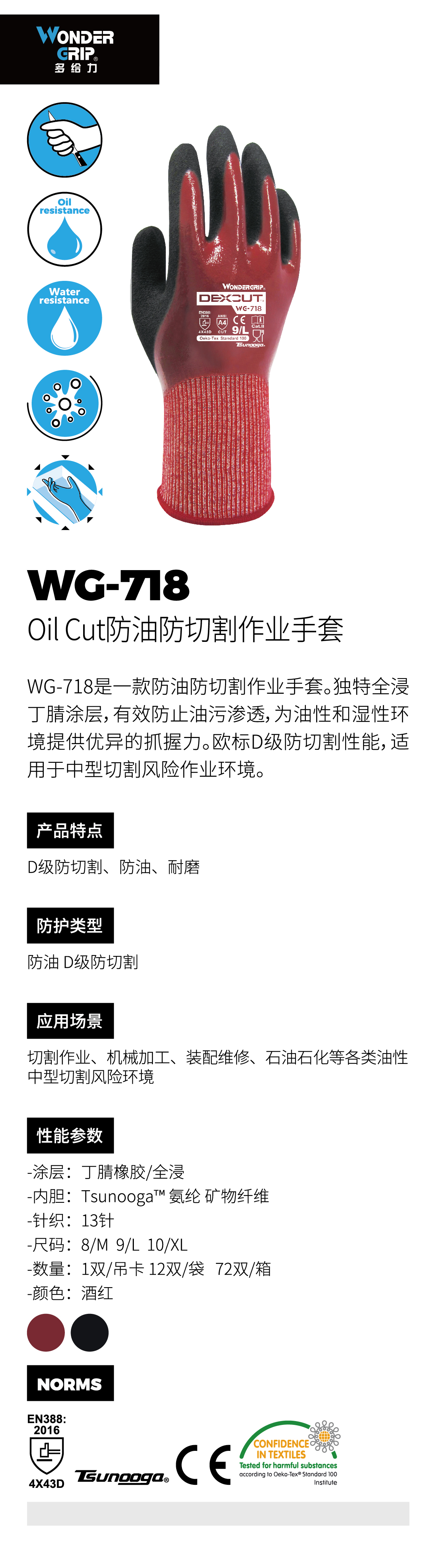 1.Wonder Grip独创丁腈全浸技术,为复杂作业环境而制,兼具防油和五级防割两大功能。