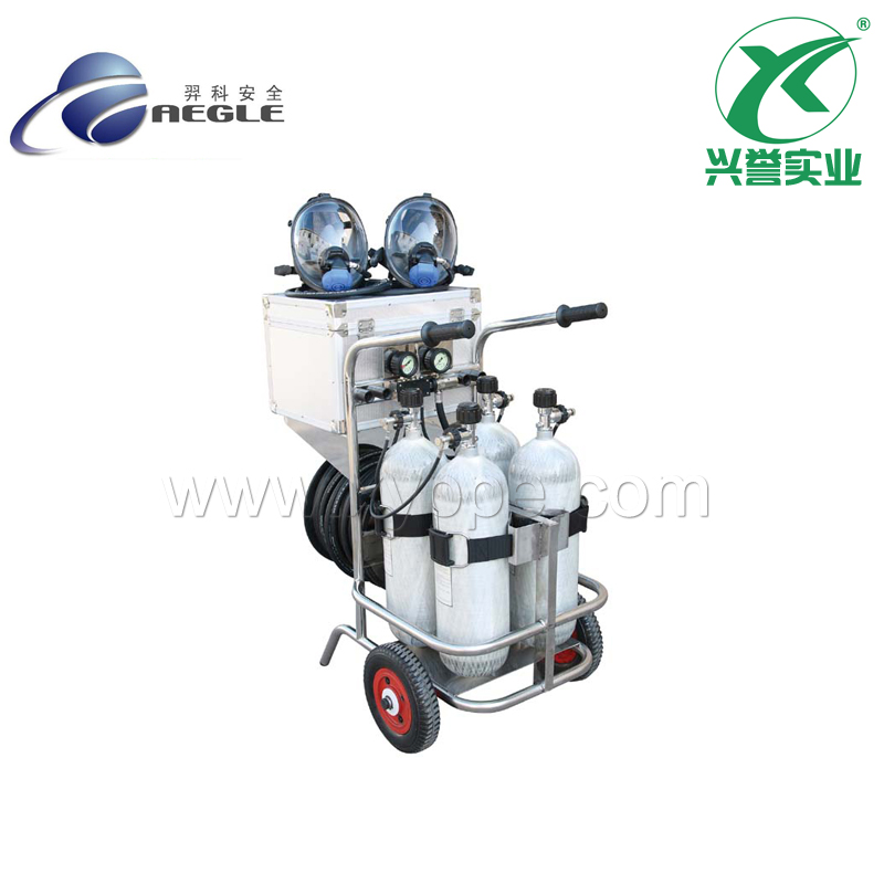 移动供气源可以为一个或两个人供气。适用于长时间工作或由于呼吸器背板阻碍无法进入或活动的狭隘场所。推车上可以放置4个气瓶。当气瓶中的空气不足时,报警哨会发出响亮的声音提醒作业人员。