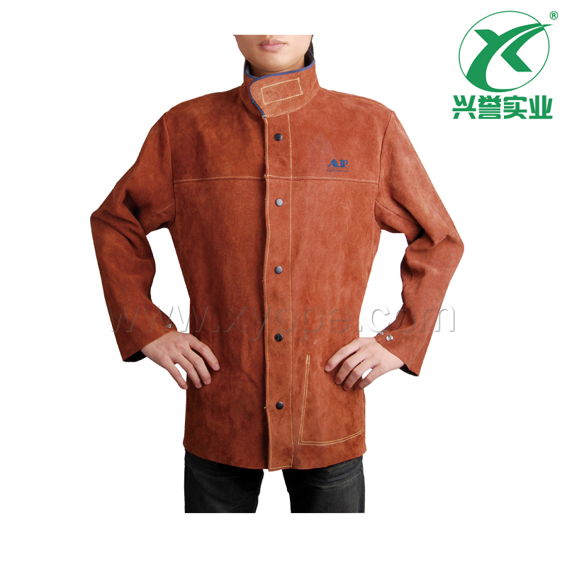 咖啡色全皮上身焊服,牛二层芯皮制成,耐磨隔热和防火性能,Kevlar防火线,受力部位双层皮加固,内置衣袋,可翻式直立衣领