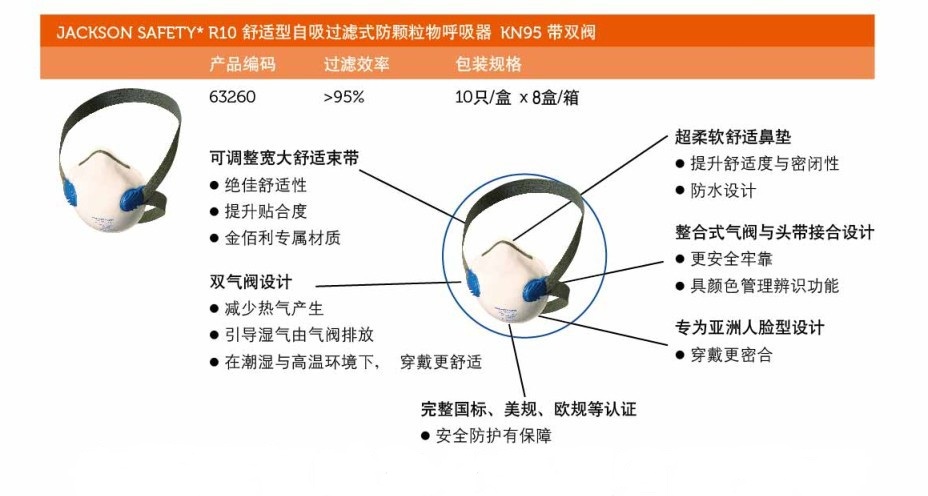 可调整宽大舒适束带;绝佳舒适性;提升贴合度;金佰利专属材质超柔软舒适鼻垫;提升舒适度与密闭性;防水设计专为亚洲人脸型设计;穿戴更密和整合式气阀与头带贴合设计;更安全牢靠;具颜色管理辨识功能双气阀设计;减少热气产生;引导湿气由气阀排放;在潮湿与高温环境下,穿戴更舒适完整国标、美观、欧规等认证;安全防护有保障