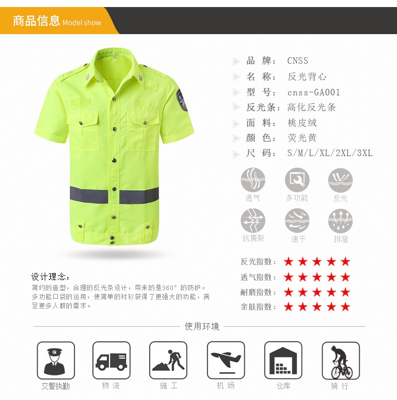 产品名称:透气男女半袖交通警示荧光服CNSS-GA001