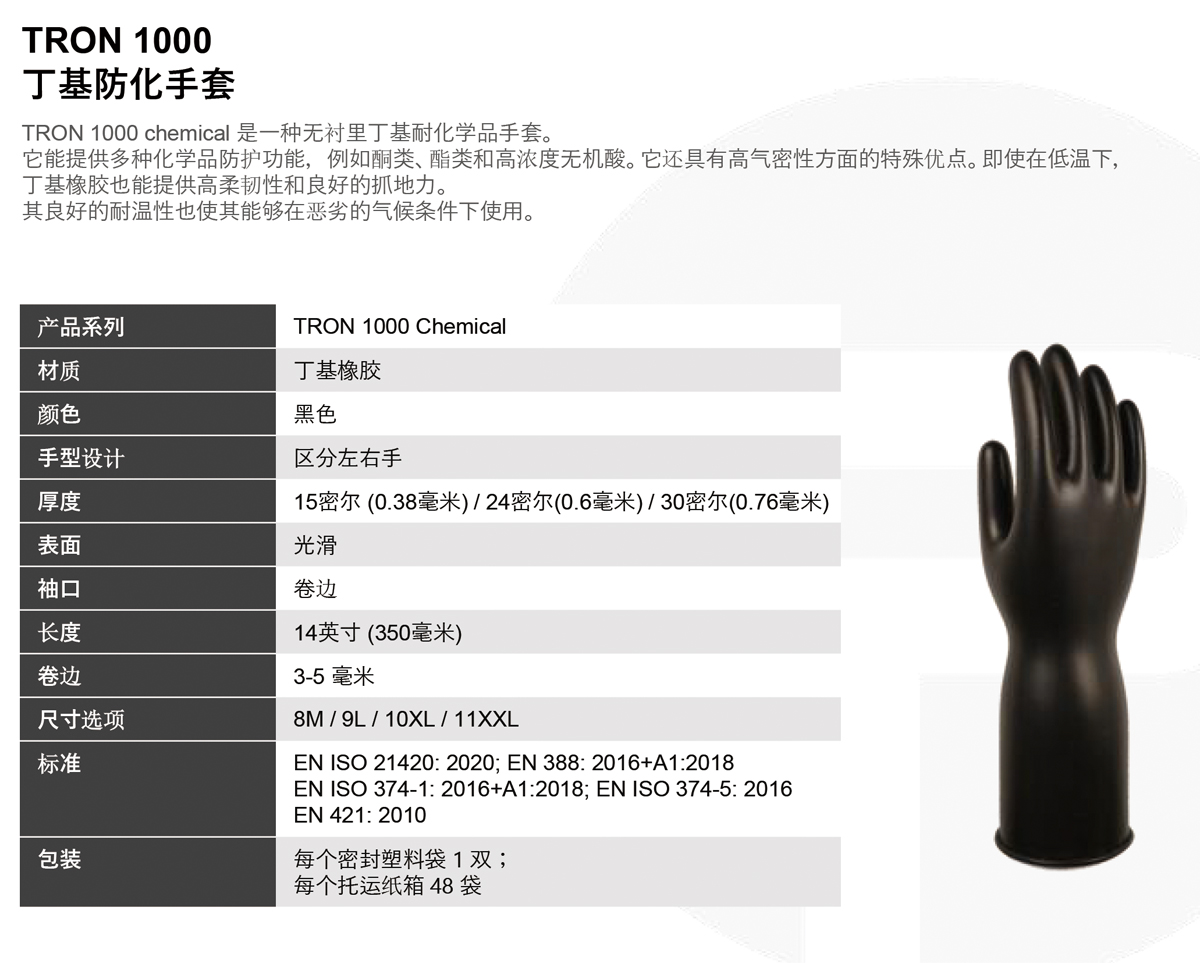 TRON 1000 chemical 是一种无衬里丁基耐化学品手套。