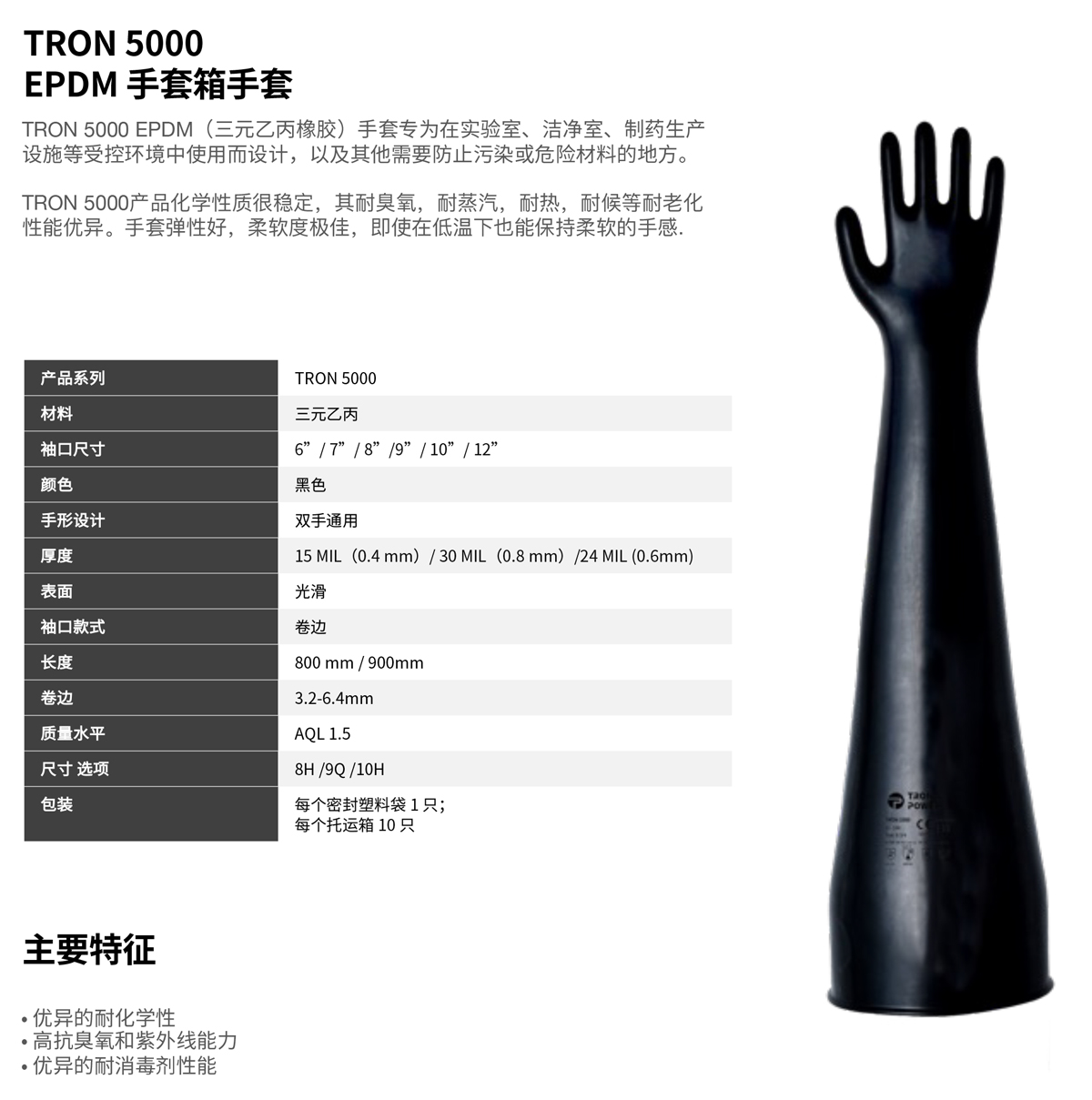 TRON 5000 EPDM (Ethylene Propylene Diene Monomer) glovebox gloves are designed for use in controlled environments such as